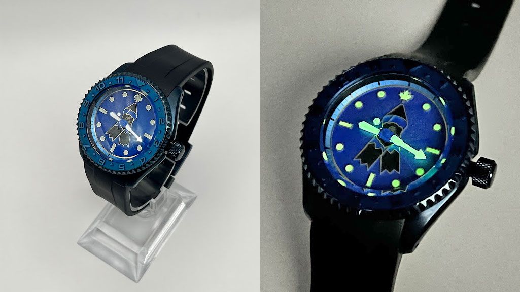 In the current configuration this watch was created in a Thin Blue Line theme to honour the men and women of law enforcement who serve their community every day. This 40 mm blue stainless steel case is accented with a blue 12hr dual time bezel, blue chapter ring with minute markers, and blue water resistant screw down crown. The theme is completed with a black silicone strap with matching blue buckle.